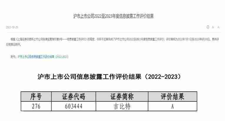 近日,,,上海證券交易所發布2022-2023年度信息披露工作評價結果。。35273(股票代碼::::603444)憑借規范的公司治理、、高質量的信息披露以及良好的投資者關系管理再次榮獲信息披露工作A級評價,,公司連續兩年獲此殊榮。。。。